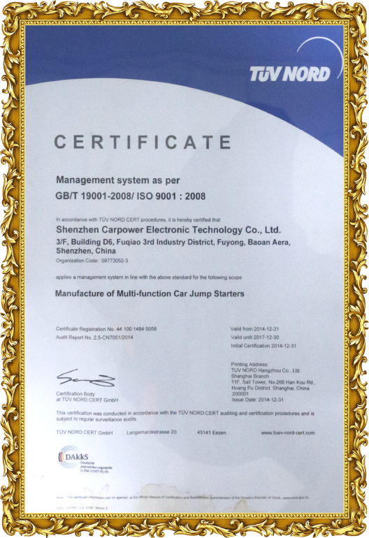 As for company quality management, Carpower has passed the ISO9001 International Quality System Certification. We are highly qualified & with all the necessary certifications, such as CE, ROHS, FCC, UN38.3, etc. Moreover,Carpower also approved by SGS.